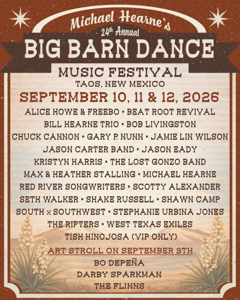 In 2003, Michael Hearne founded the Big Barn Dance Music Festival in Taos, New Mexico, with a simple goal of bringing great songwriters together in a setting that felt personal and genuine. What started as a small gathering built around music and friendship has grown into one of the most respected Americana festivals in the Southwest, while still holding onto the spirit it was founded on.